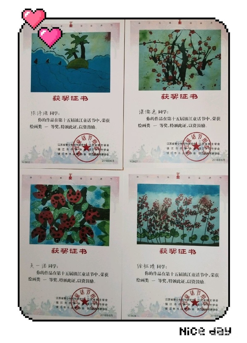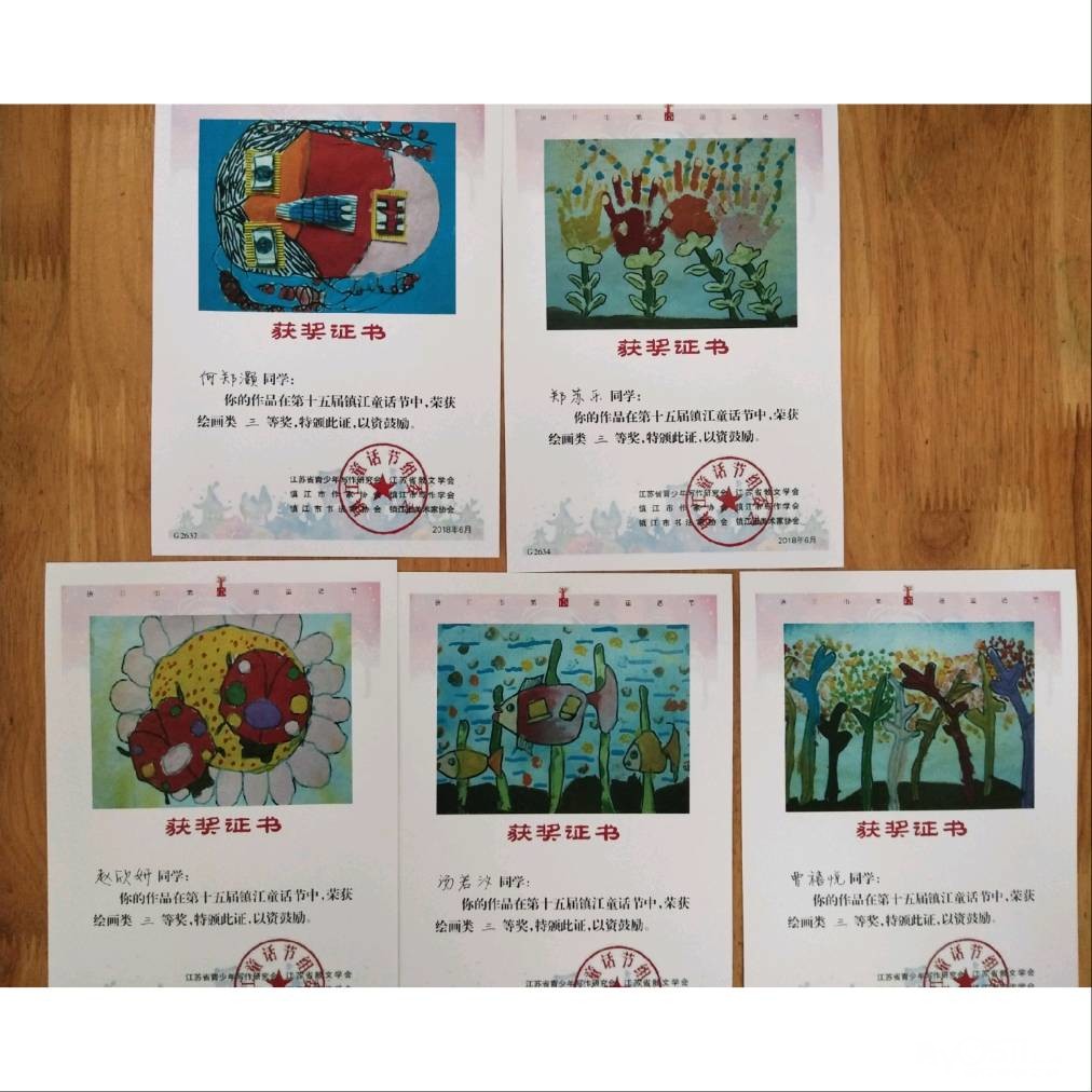 镇江市第十五届童话节绘画比赛我班4名幼儿获得了一等奖,6名幼儿获得了二等奖,5名幼儿获得了三等奖![玫瑰][玫瑰][玫瑰][强][强][强]
