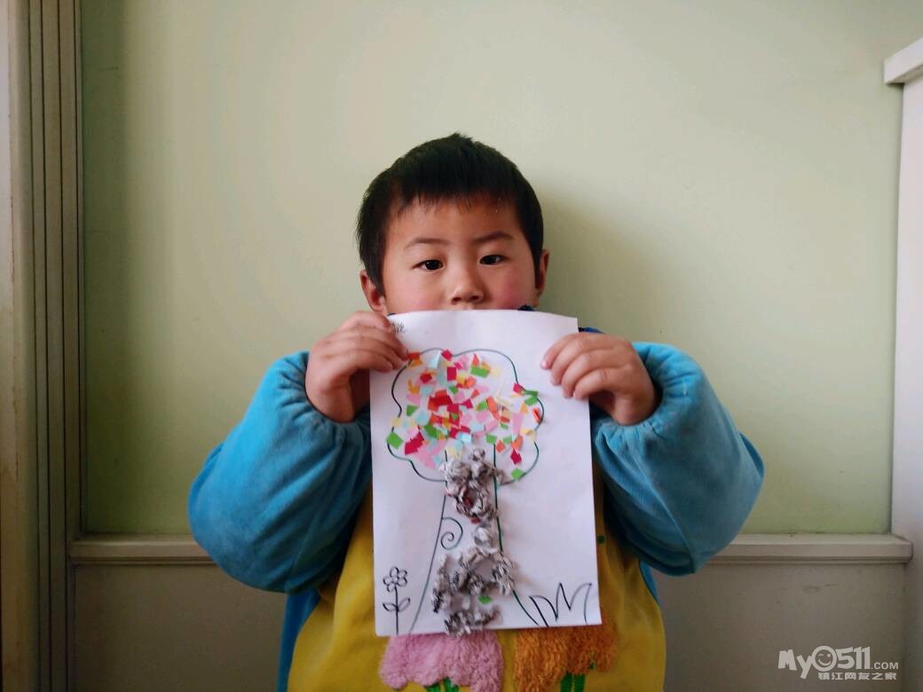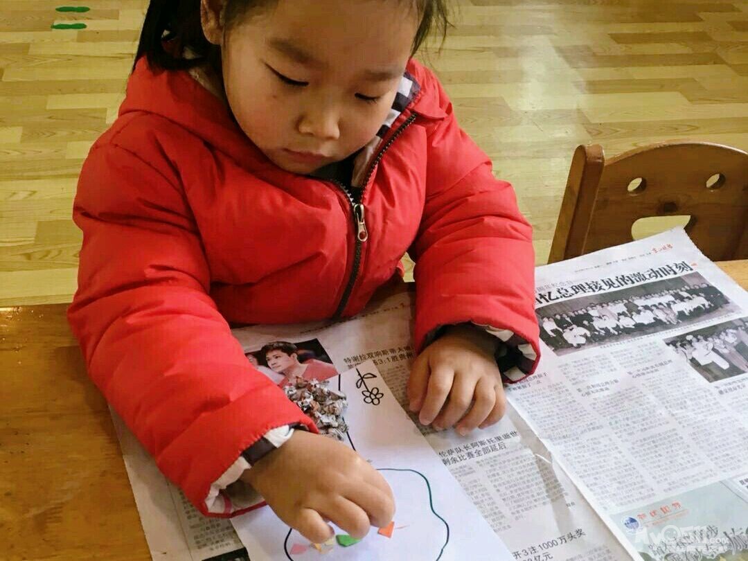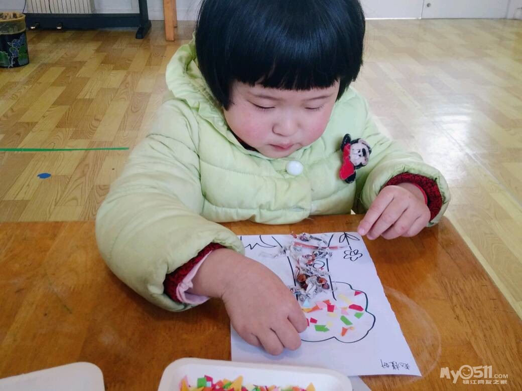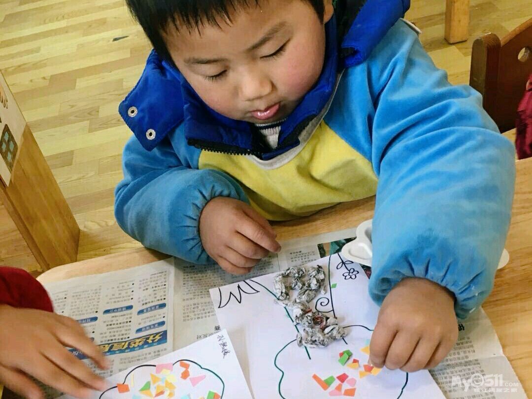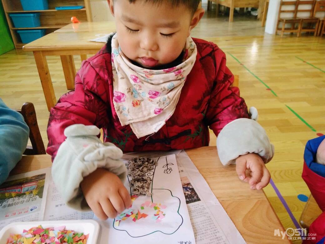 宝宝们忙着做粘贴画,用报纸揉成小球装饰树根,用彩色的纸屑装饰树冠。