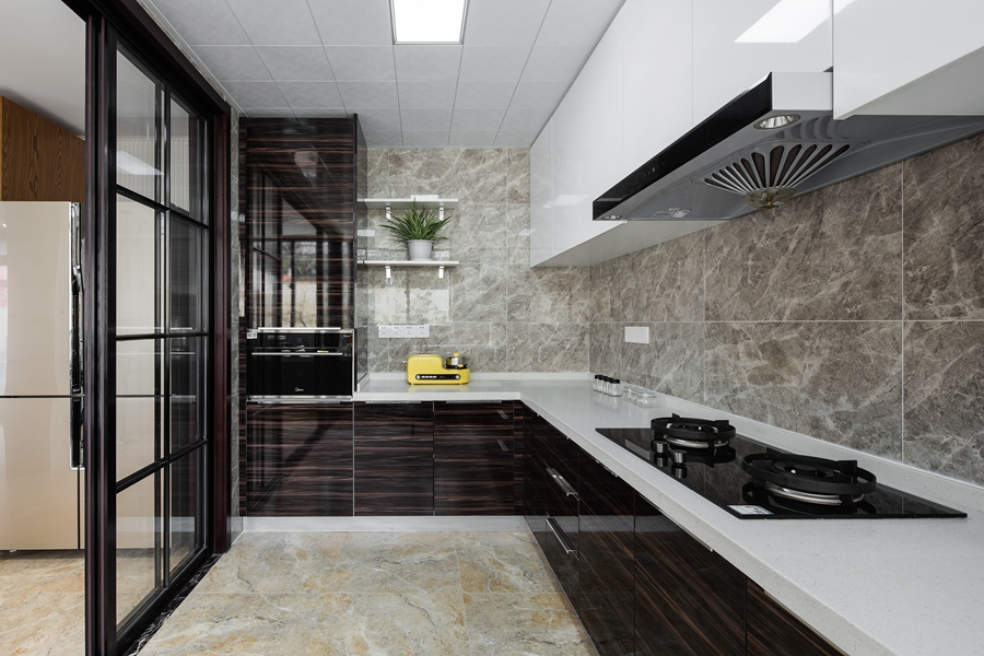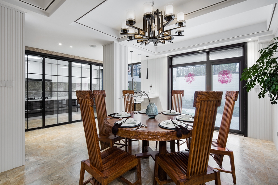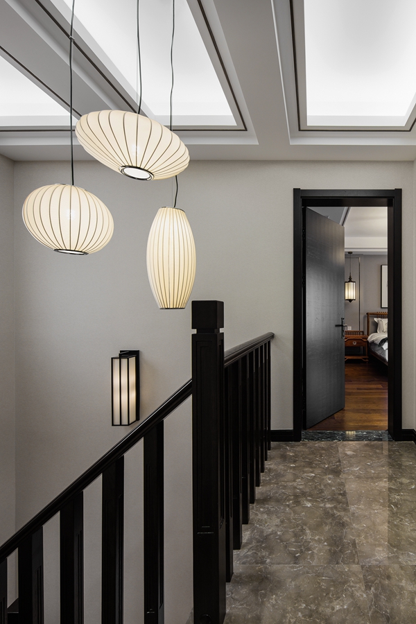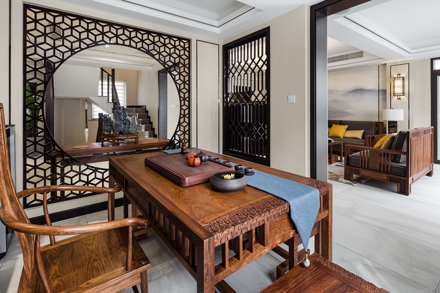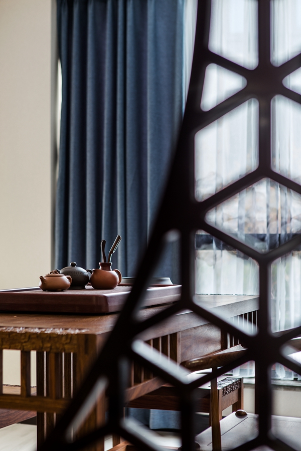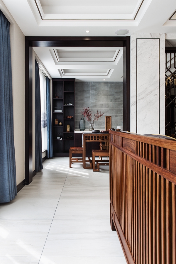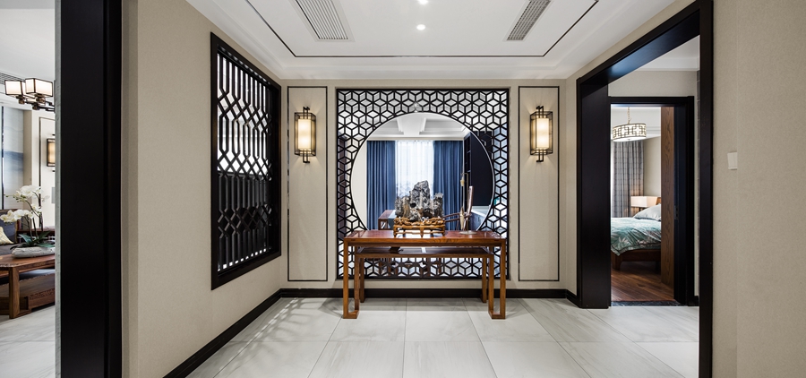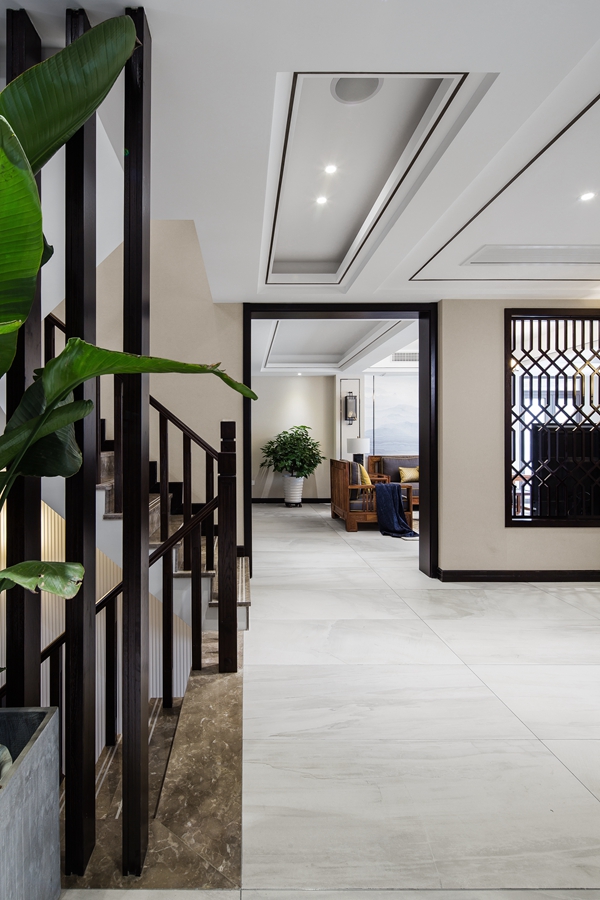 和内敛的氛围,顶面和墙面的黑色线条形成空间的层次感。浅色墨纹地面延展入室,半通透隔断将东方元素融入其中。