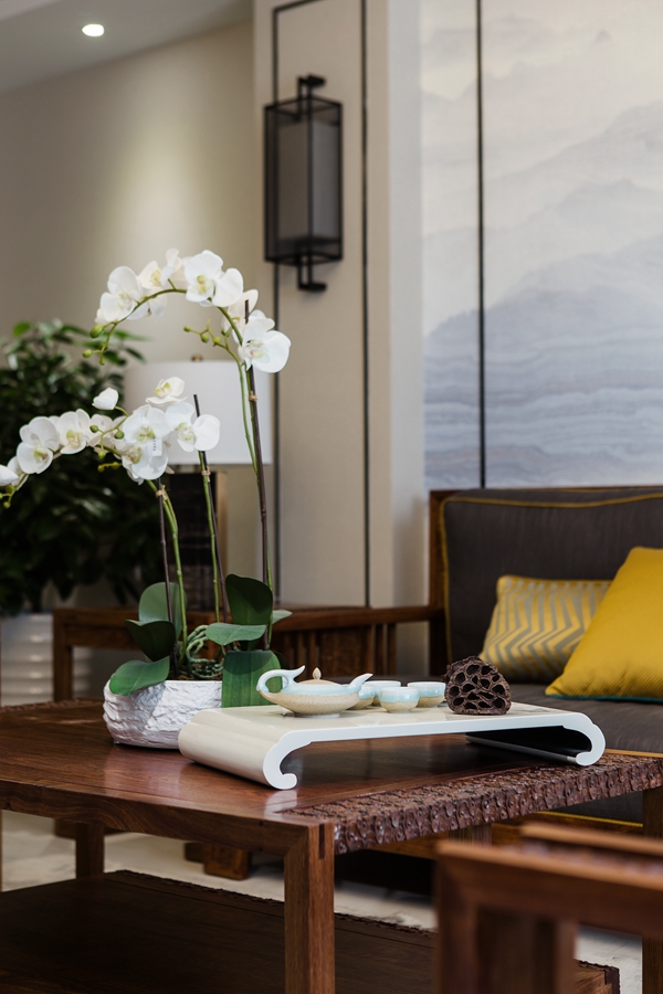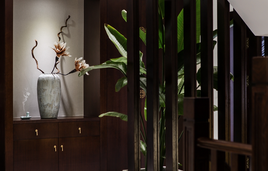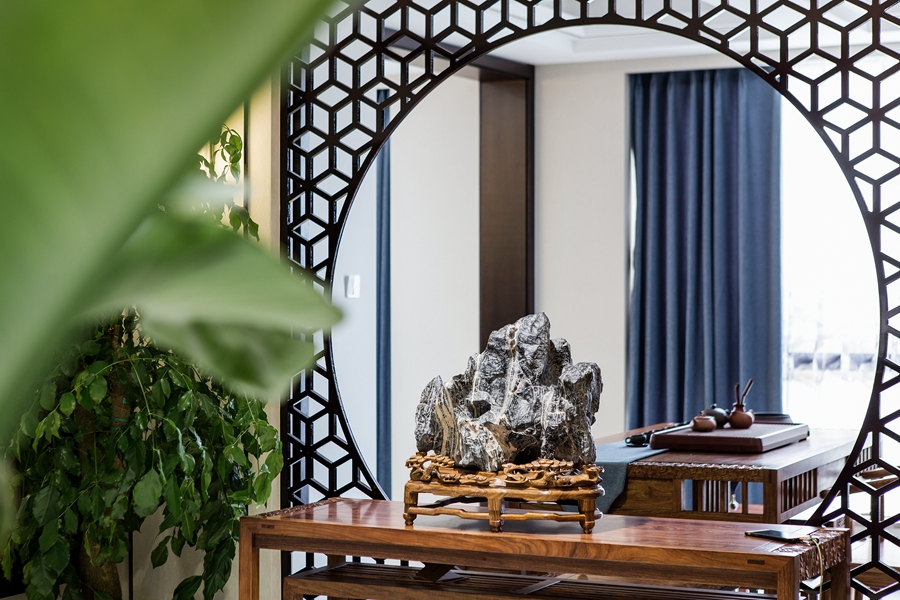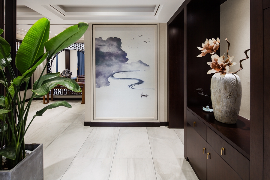 石雕、器皿、花艺,古朴或灵动的为这个空间注入不一样的文化气息。水墨写意壁画将山水意境引入其中,让人仿若