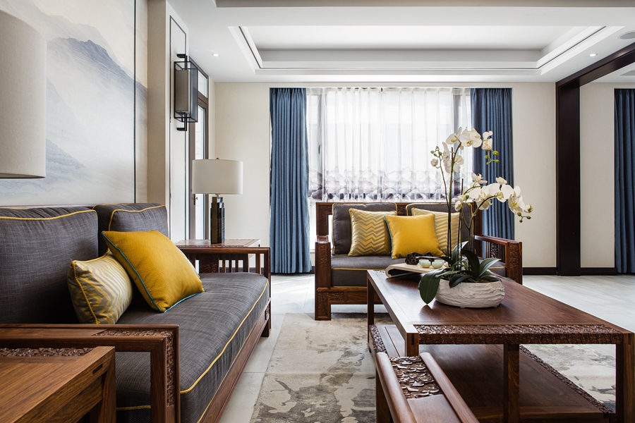 从玄关到客厅,大量的落地玻璃窗引入光线,深色木作及米灰色墙面搭配蓝色窗帘,在光影斑驳之间,营造出平