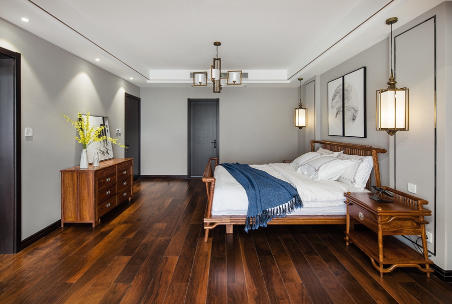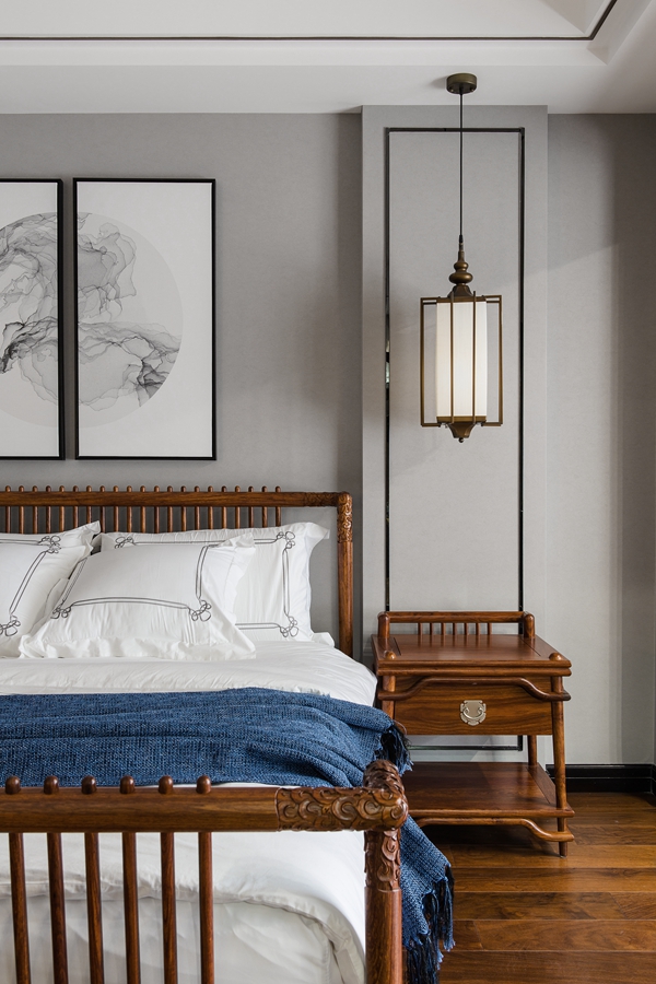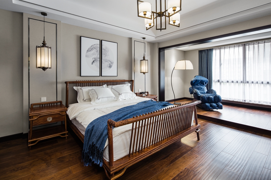 主卧室并未过多着墨造型设计,而是用简单的黑色线条勾勒出顶面及墙面的立体感。木质家具、禅意壁画及窗帘