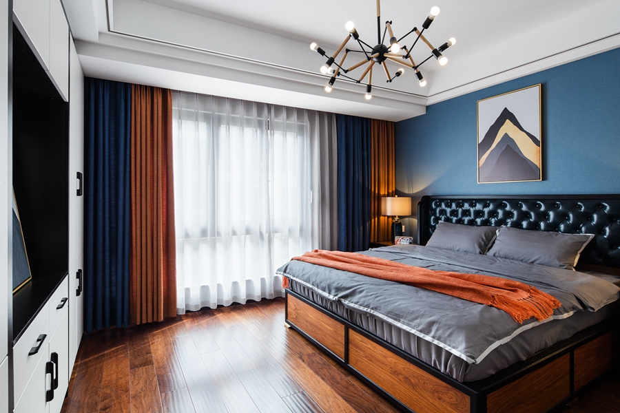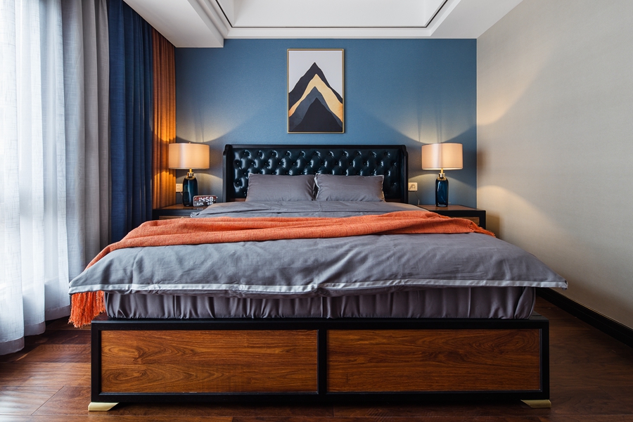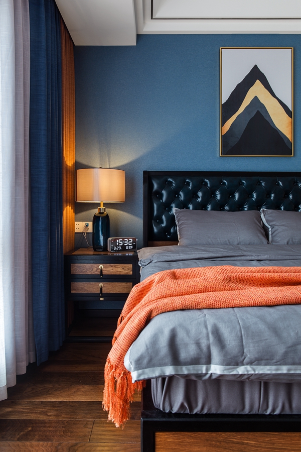 的空间。次卧室为小孩房,在颜色的选择上也更偏浓烈。蓝色背景墙纸给人一种宁静感,金属挂画点缀其间,蓝橙相