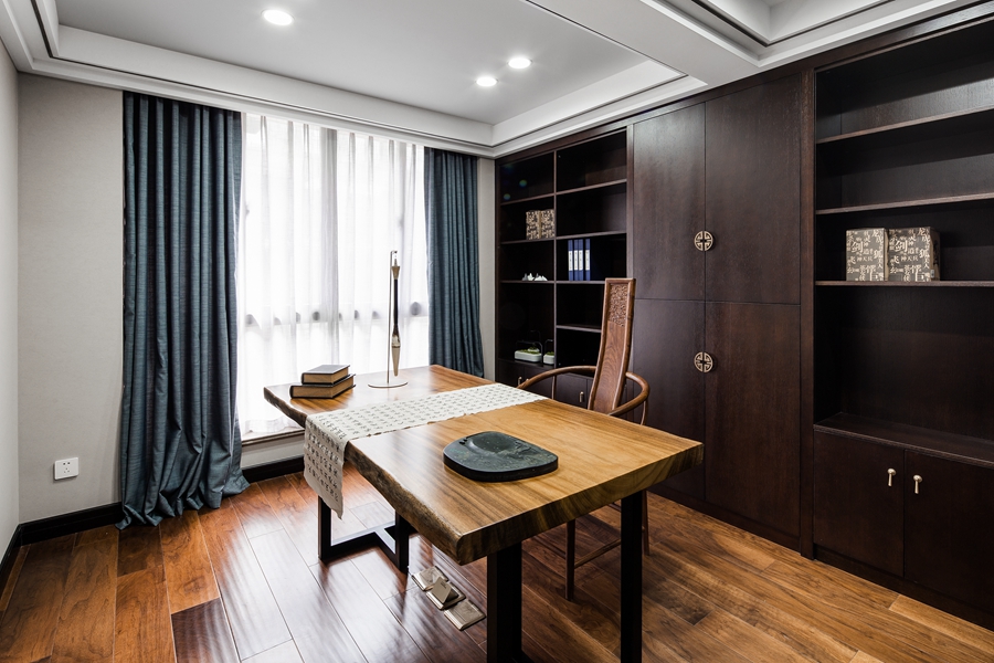 的搭配皆为营造一个能隔绝室外的喧嚣,让人收起浮躁内心的休息处,套间内的书房则是屋主挥毫列锦绣,落纸如云烟