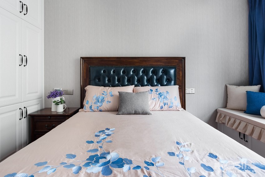蓝色真皮软包床,搭配了蓝色窗帘,给整个空间一个和谐低调之美感。