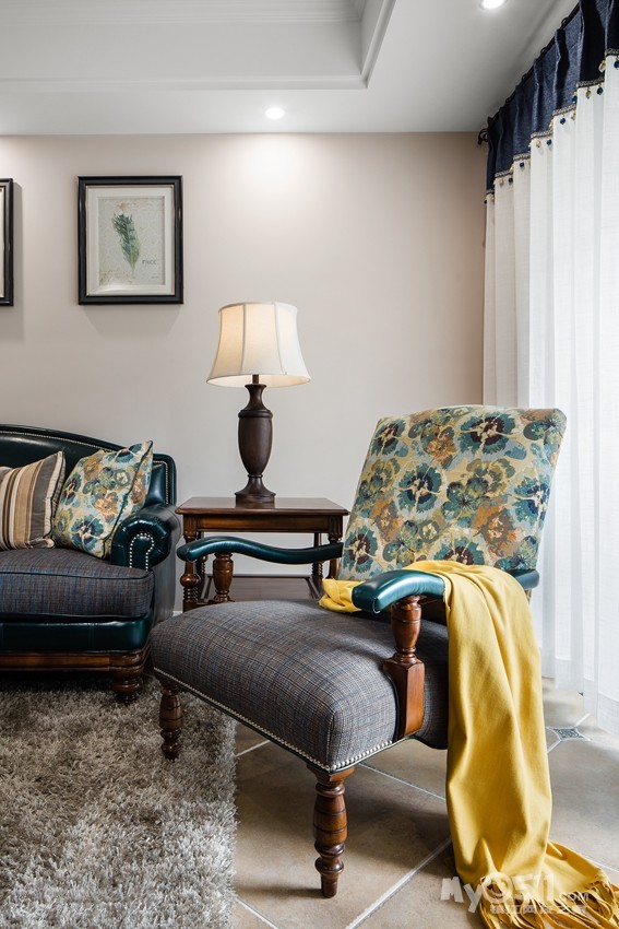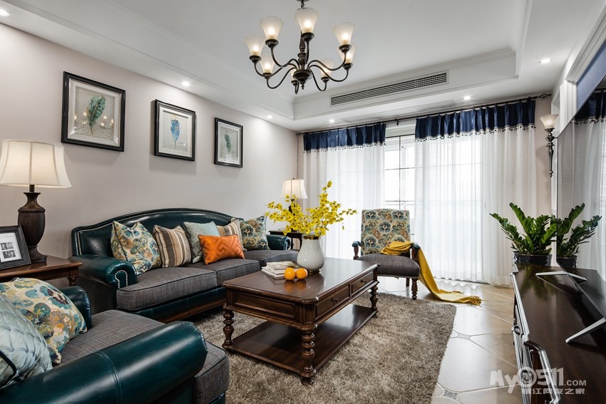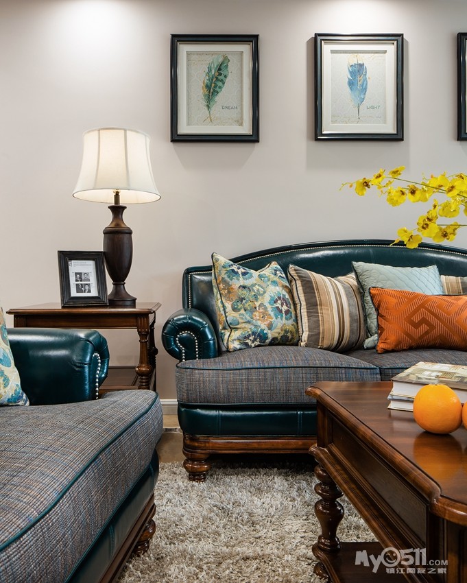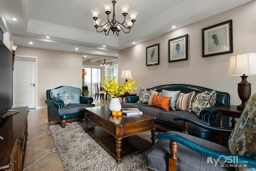 孔雀蓝皮结合布艺进口面料的沙发,作为客厅的焦点,烘托出地毯以及抱枕、装饰画,