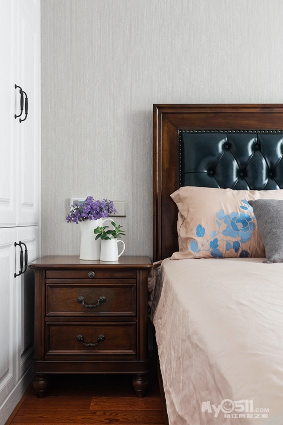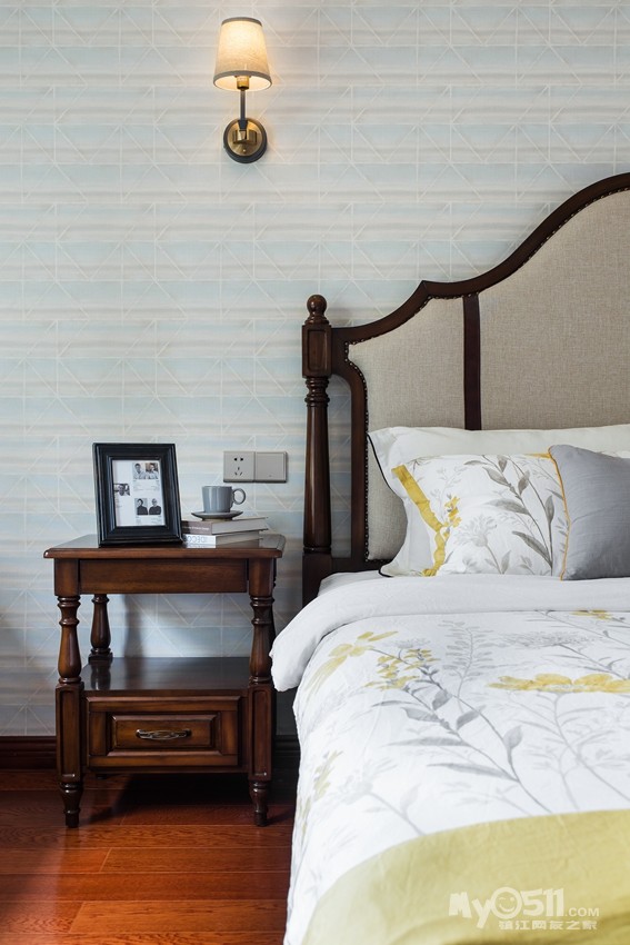 床头舒适的亚麻面料时尚优雅,裸露的木质框架塑造出床体的流畅线条,