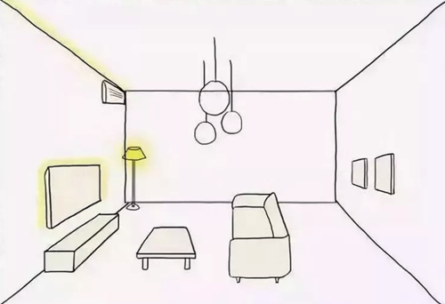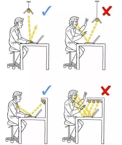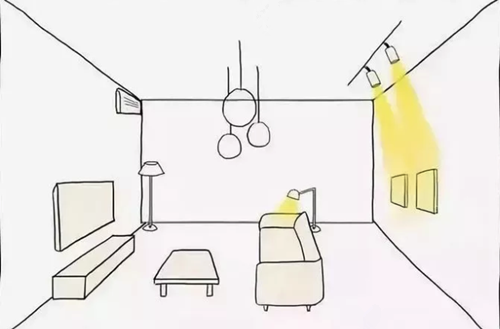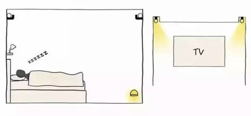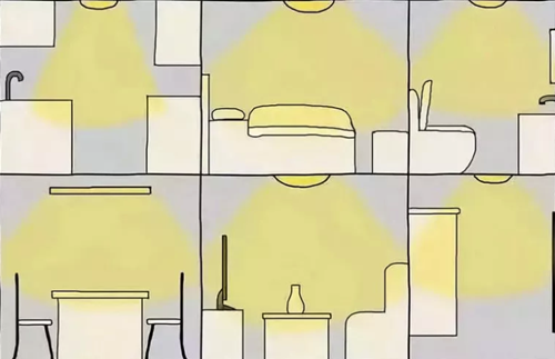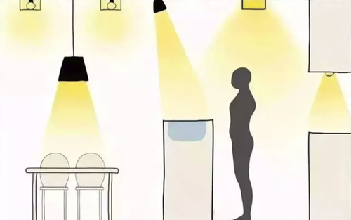 如果是射灯这种指向性的灯光,那么射灯的角度就需要经过专门的计算和调整,至少不能在我们经常活动的区域随便就能看到射灯。
