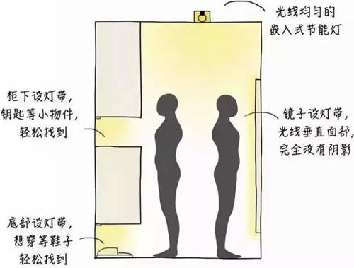 衣帽间需要均匀、无色差的环境灯,镜子两侧设置灯带,衣柜和层架应有补充照明。