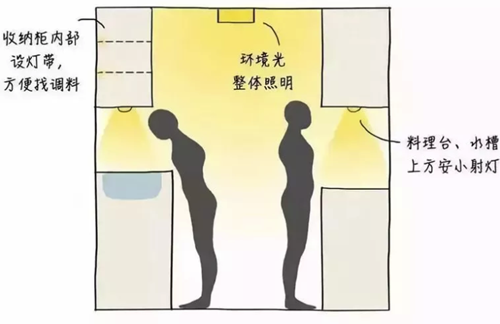 在料理台和水槽的上方增加焦点光,安装小射灯用于局部和重点照明。