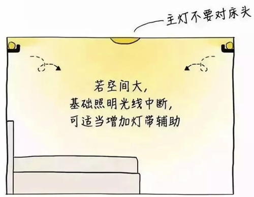 整体照明可以装在卧室中央(床尾的天花板上),避开躺下时会让光线直接进入视线的位置。