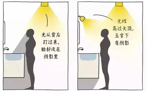 在镜前区增加镜前照明,光源均匀打在脸上,可以避免出现上述情况。