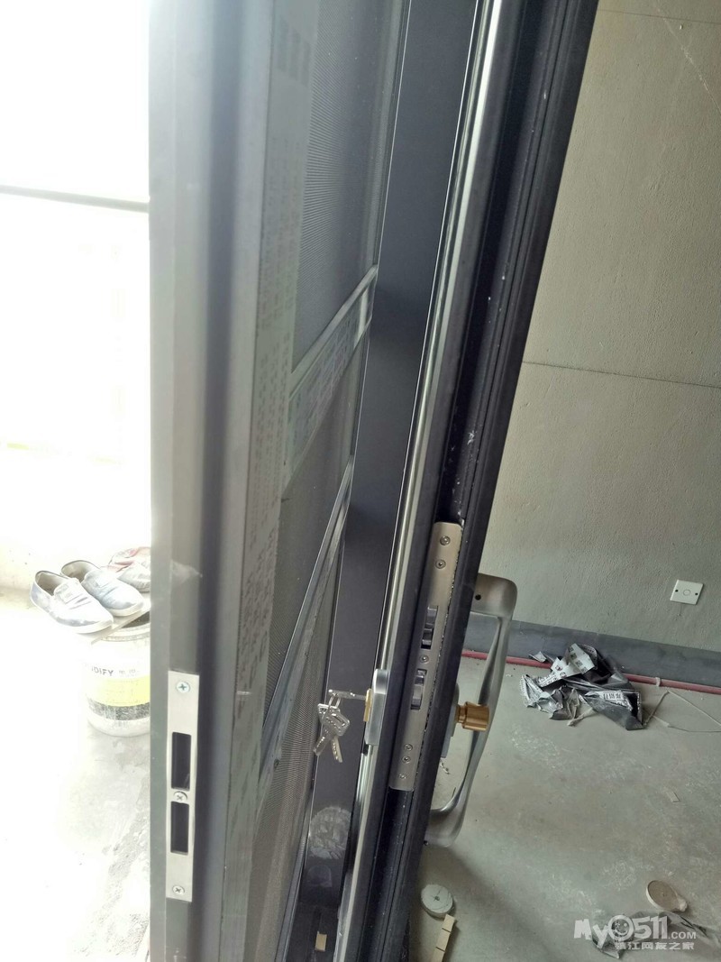 重型门安装好了,看上去很厚重,还带防蚊金刚砂的门,推拉起来还是非常轻巧。就是门锁装反了,需要调换一下。