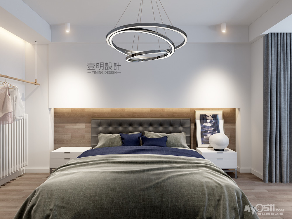 主卧因为床头这面墙两边各有一个柱子,为了弱化柱子,小明原来的设计方案是这样的