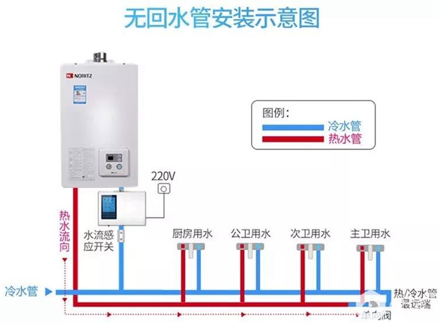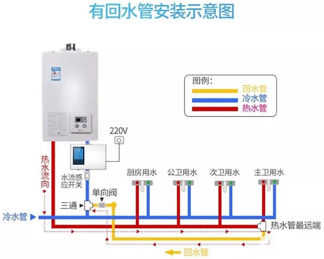 在距离热水器远端的用水端加装一根回水管,同时加装一个水流感应开关和单向阀。