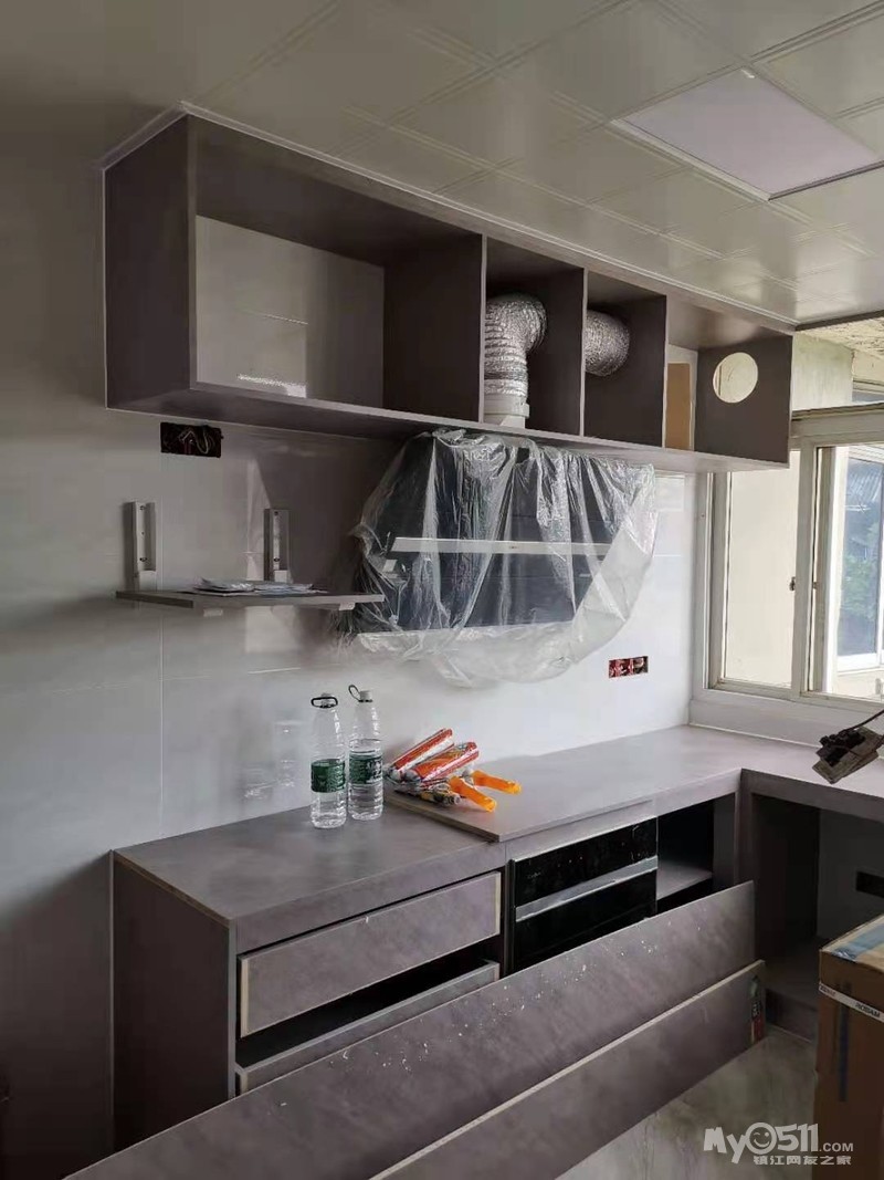 厨房橱柜打好了,联系师傅安装油烟机燃气灶,厨房初见雏形