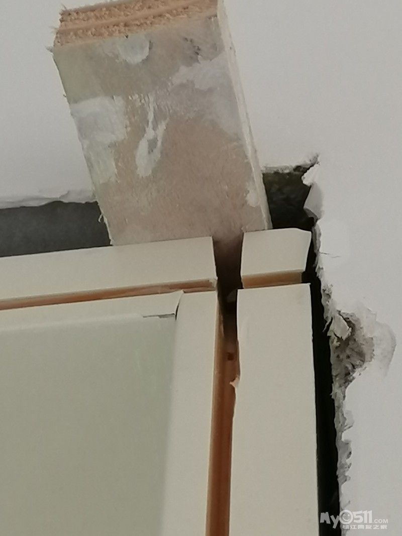 门套的板子薄如曲奇饼干。里面填充的木方全是缺口,且少的可怜,安装师傅需要满世界找碎木块子去填充墙与门套板中间的巨大缝隙。