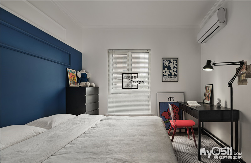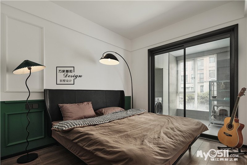 次卧的风格与客餐厅主题风格一致,只是在色彩上选用了复古质感的墨绿。
