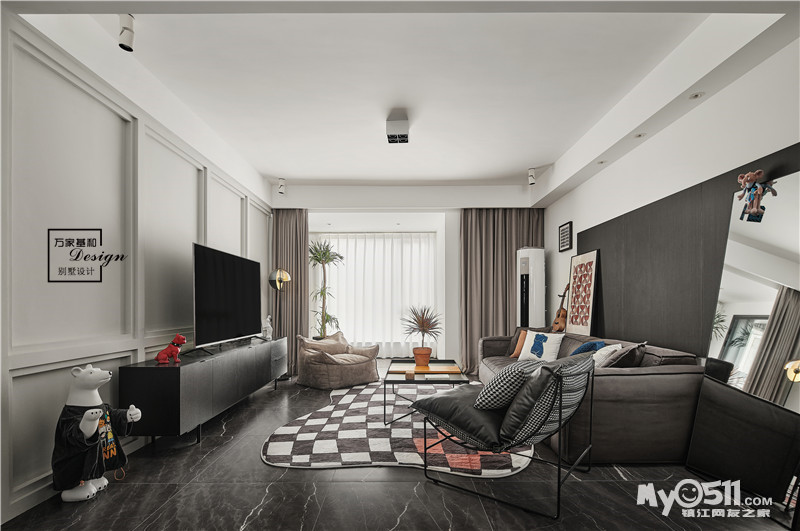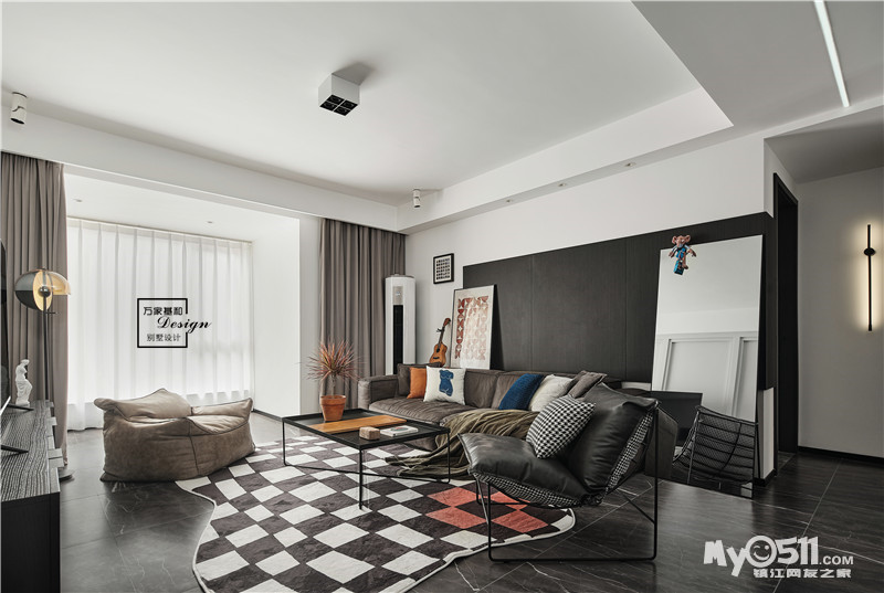 黑白格纹的地毯与客厅呼应,将摩登时尚与静谧内敛囊括在一个氛围里。