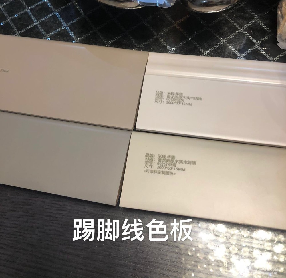 踢脚线本想跟房门套和护墙板一起定制的,单件要100一米,果断淘宝购色板配色,实木烤漆,预算省80%