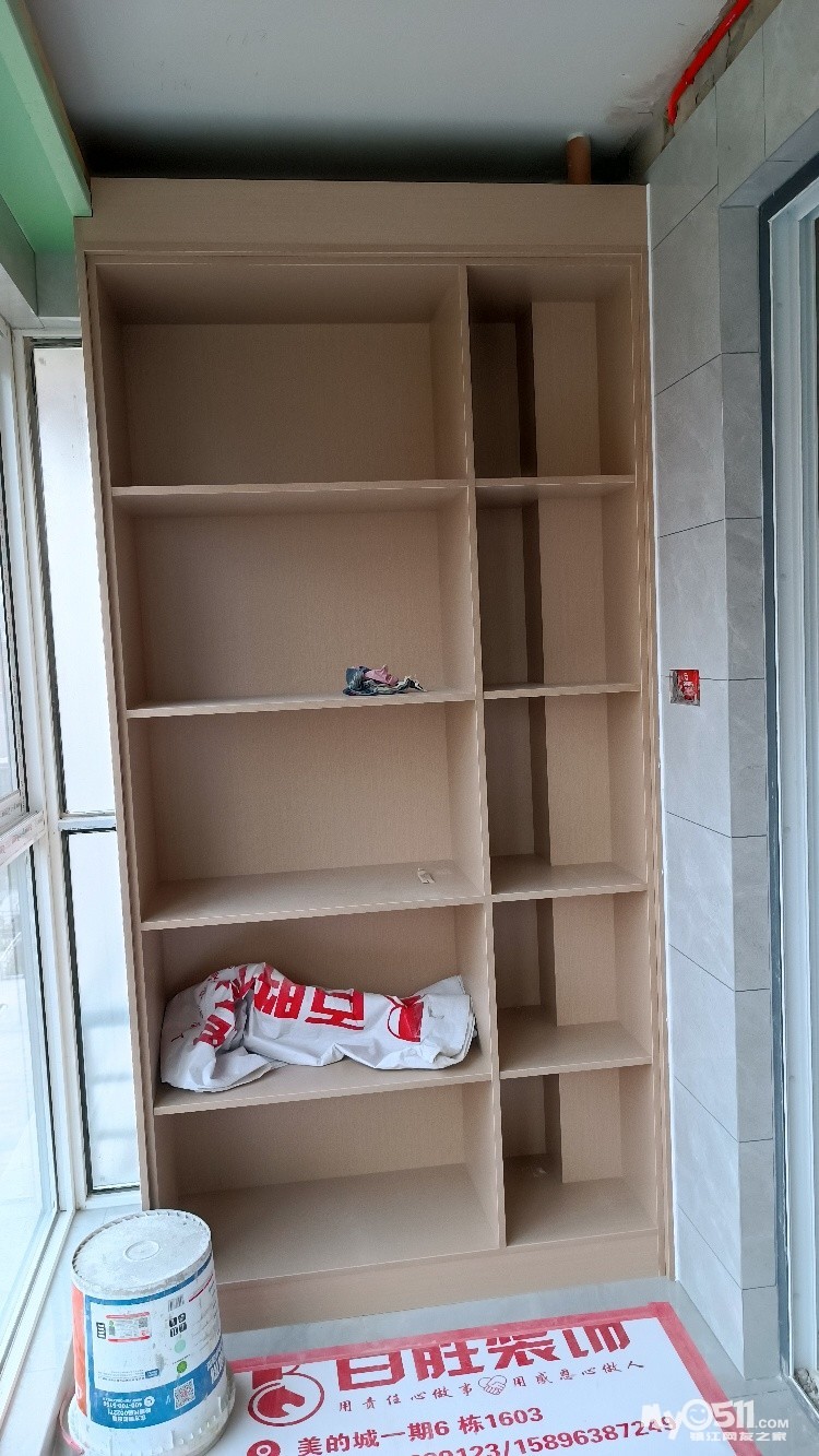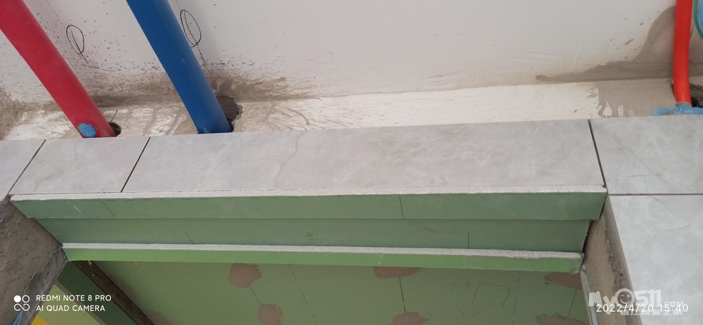 封阳台铝合金下沿的瓷砖也完成了,阳台两侧最后分别是洗衣柜和放零散物品的橱柜。