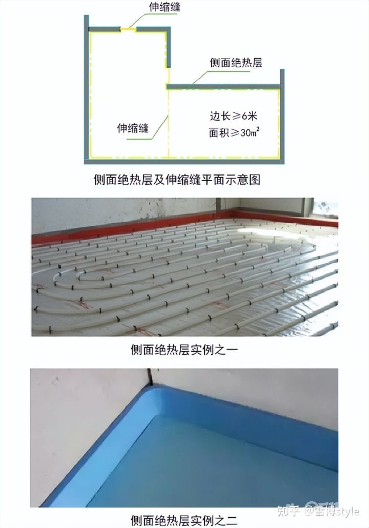 首先在与内外墙、柱及过门等交接处应敷设不间断的侧面绝热层,侧面绝热层之间连接处应采用搭接方式,搭接宽度不小于10mm。另外,侧面绝热层材料与墙、柱应有可靠的固定方式(见侧面绝热层及伸缩缝平面示意图)。侧面绝热层应从辐射面绝热层的上边缘做到填充层的上边缘,交接部位应有可靠的固定措施,与辐射面绝热层连接应严密。
