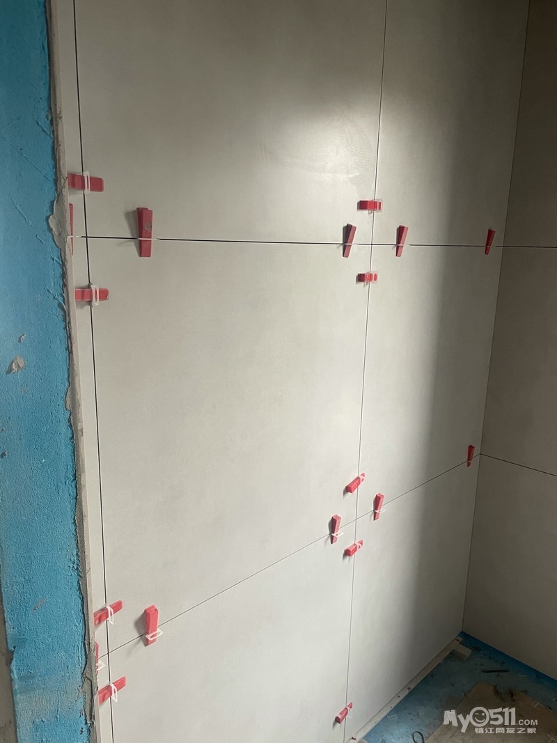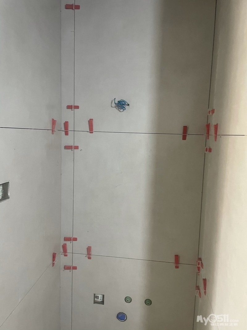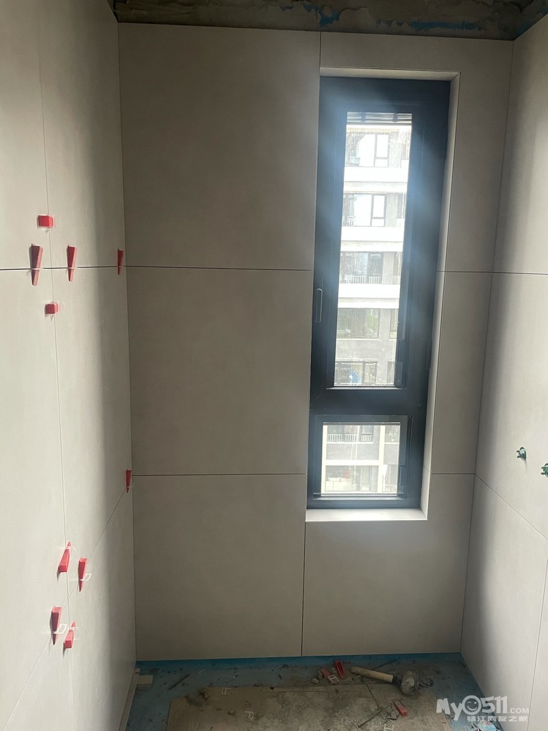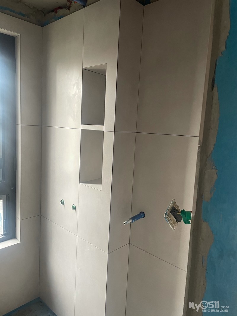 这面墙只有83公分,一块80公分的大砖还会剩下一点空隙难看,再裁一块2-3公分的小条子更难看,瓦工师傅先把80的砖裁成70的,再裁了个10多公分的条子,非常漂亮