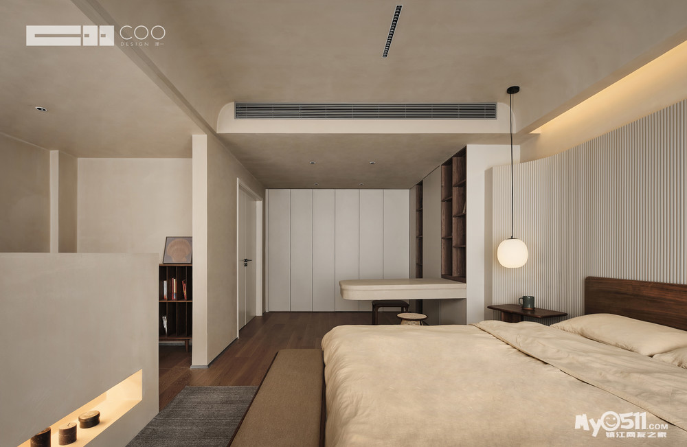 视线通过材质的过渡流转,流线型的墙面、温馨雅致的材质,人在其中,建立起“被包裹”的安全感。