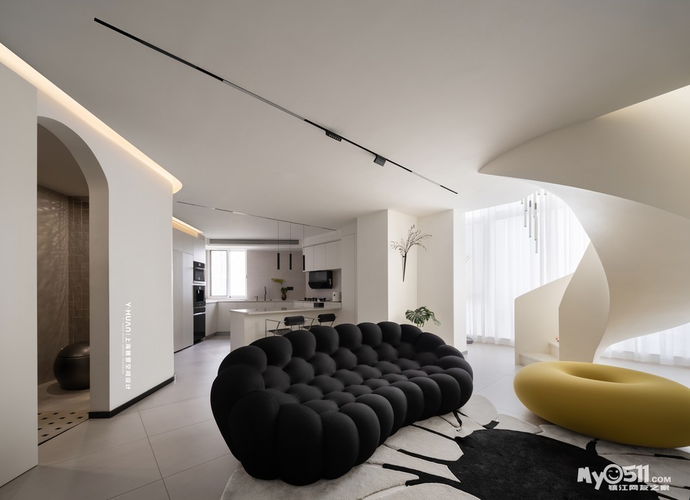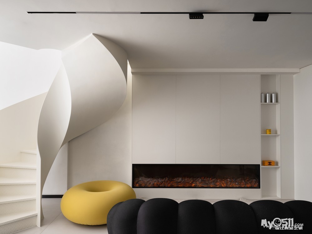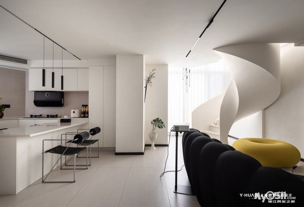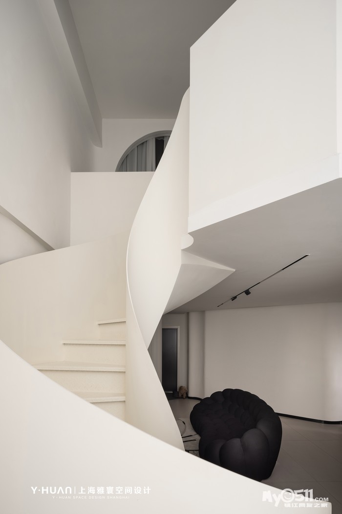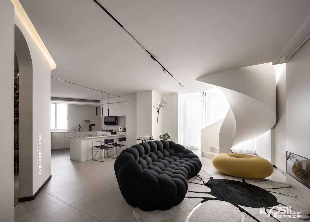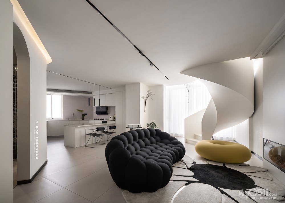 本案是 loft公寓房,设计师袁欣在平面格局上花了很大的心思,用大宅思维打破原来的格局重新规划,把原有矮小的空间改造成为大宅的效果,在原有阳台处去除部分楼板,结合钢结构旋转楼梯设计出挑空空间,让本来矮小空间立刻变为视野开阔,空间通透的大宅效果。