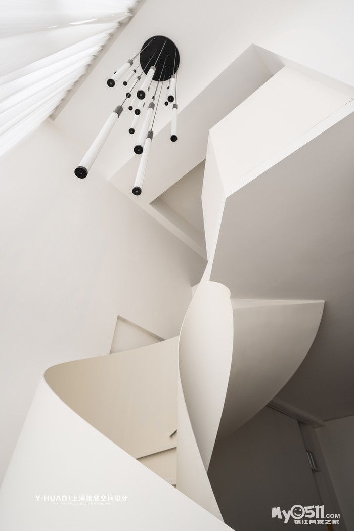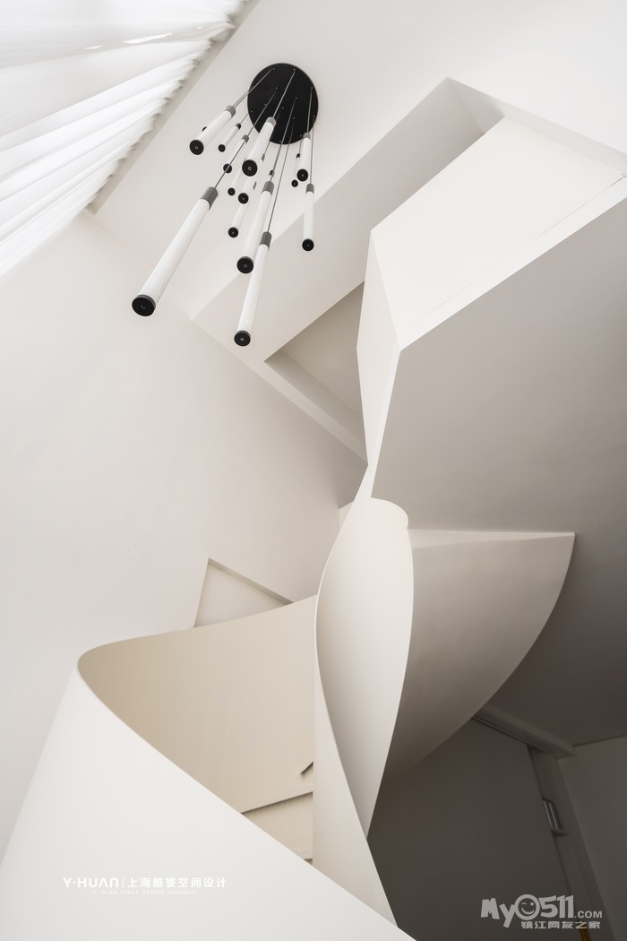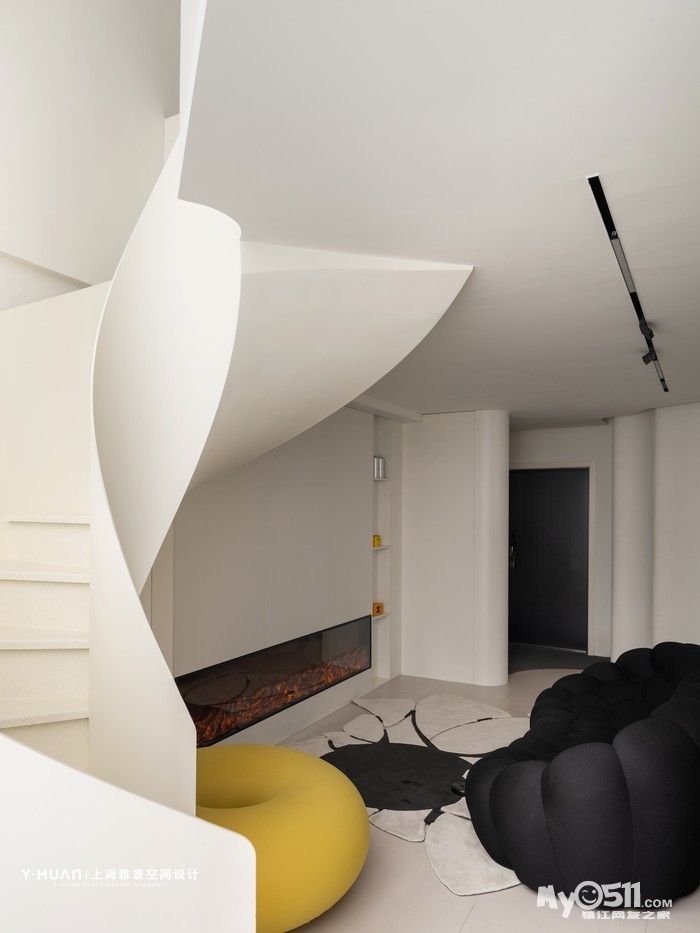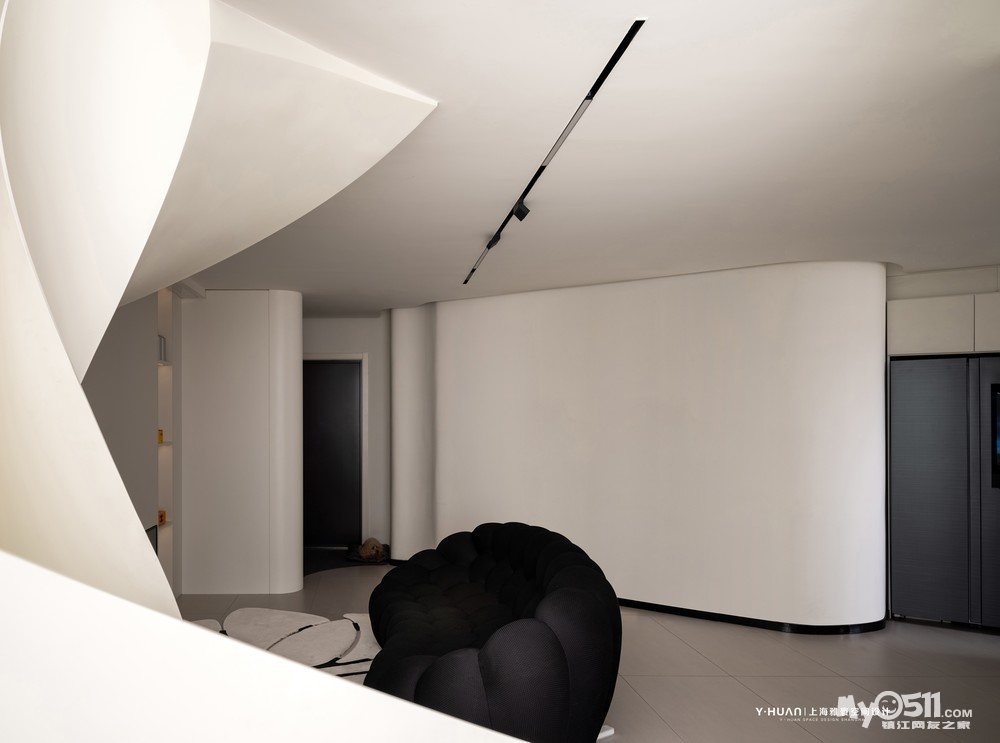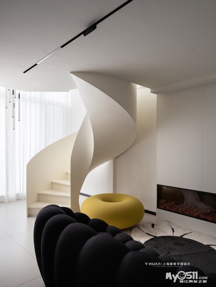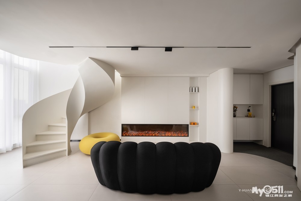 本案是 loft公寓房,设计师袁欣在平面格局上花了很大的心思,用大宅思维打破原来的格局重新规划,把原有矮小的空间改造成为大宅的效果,在原有阳台处去除部分楼板,结合钢结构旋转楼梯设计出挑空空间,让本来矮小空间立刻变为视野开阔,空间通透的大宅效果。