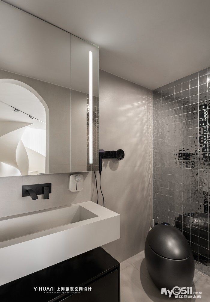 设计师将进门原来特别小的方形卫生间,改成了干湿分离的曲线型的卫生间,既增加了空间感也增加卫生间的功能性