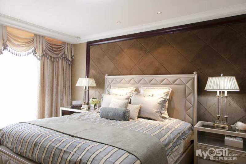 美式家居的卧室布置较为温馨,作为主人的私密空间,主要以功能性和实用舒适为考虑的重点,一般的卧室不设顶灯,多用温馨柔软的成套布艺来装点,同时在软装和用色上非常统一。