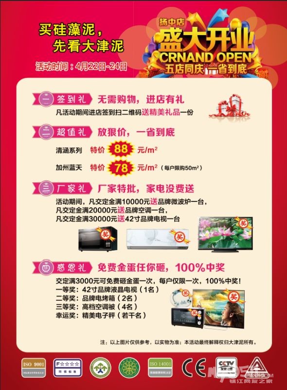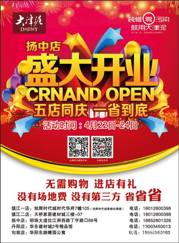 没有第三方,没有场地费。扬中店面试营业期间(4月22—24日)五店同庆,在店面与您不见不散!!!