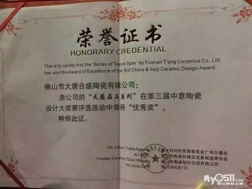 大唐合盛·瓷砖“天籁晶石”系列荣获中意陶瓷设计大奖赛优秀奖