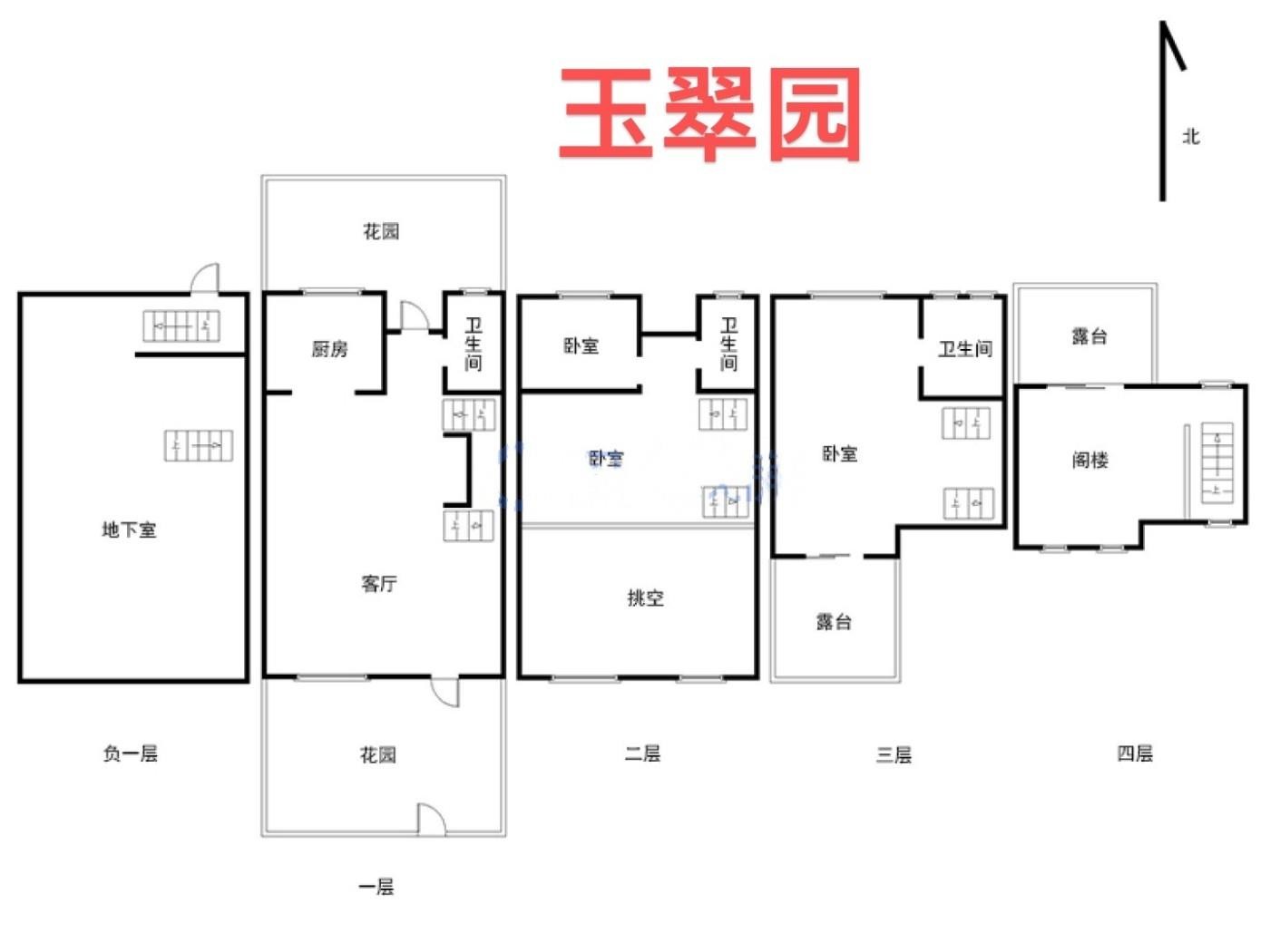 中冶玉翠园联排别墅共5层,地下室通向地下车库,一楼超大双开间挑空客厅朝南,厨房和卫生间朝北,南北花园