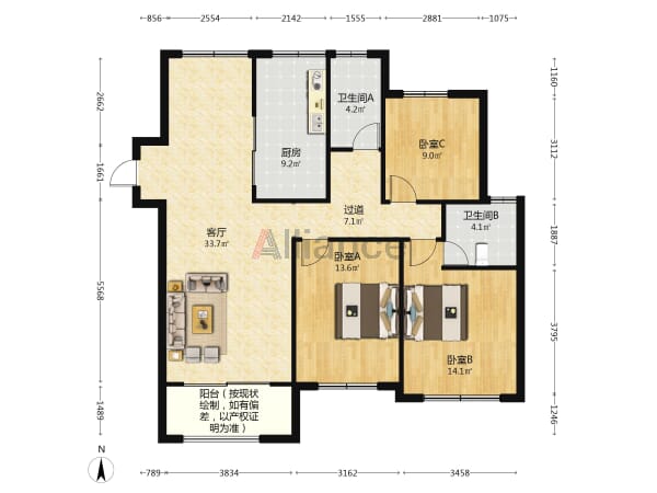 松盛园黄金二楼98平2室2厅装修清爽独立车库带平台