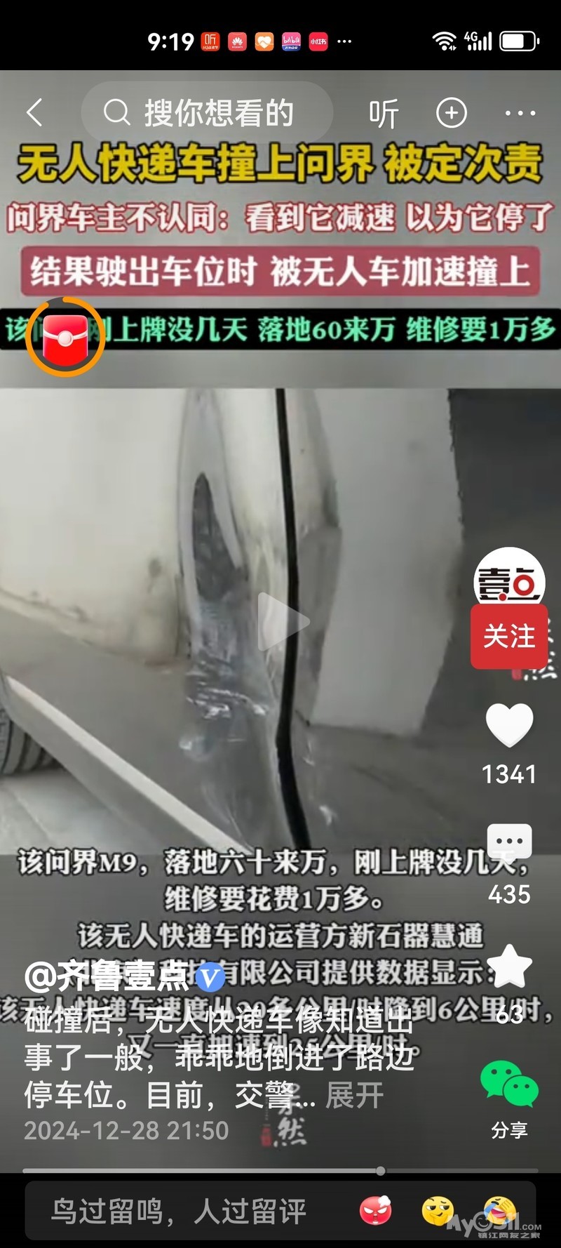 近日,一起无人快递车与问界M9的交通事故引发了广泛关注。据最新消息,事故发生在几天前,沈先生驾驶的问界M9在路边停车时,被一辆无人快递车撞击。幸运的是,无人快递车在碰撞后自动驶入路边停车位,未造成更严重的后果。问界M9是一款价值六十余万的高端车型,且事发时车辆刚上牌不久。