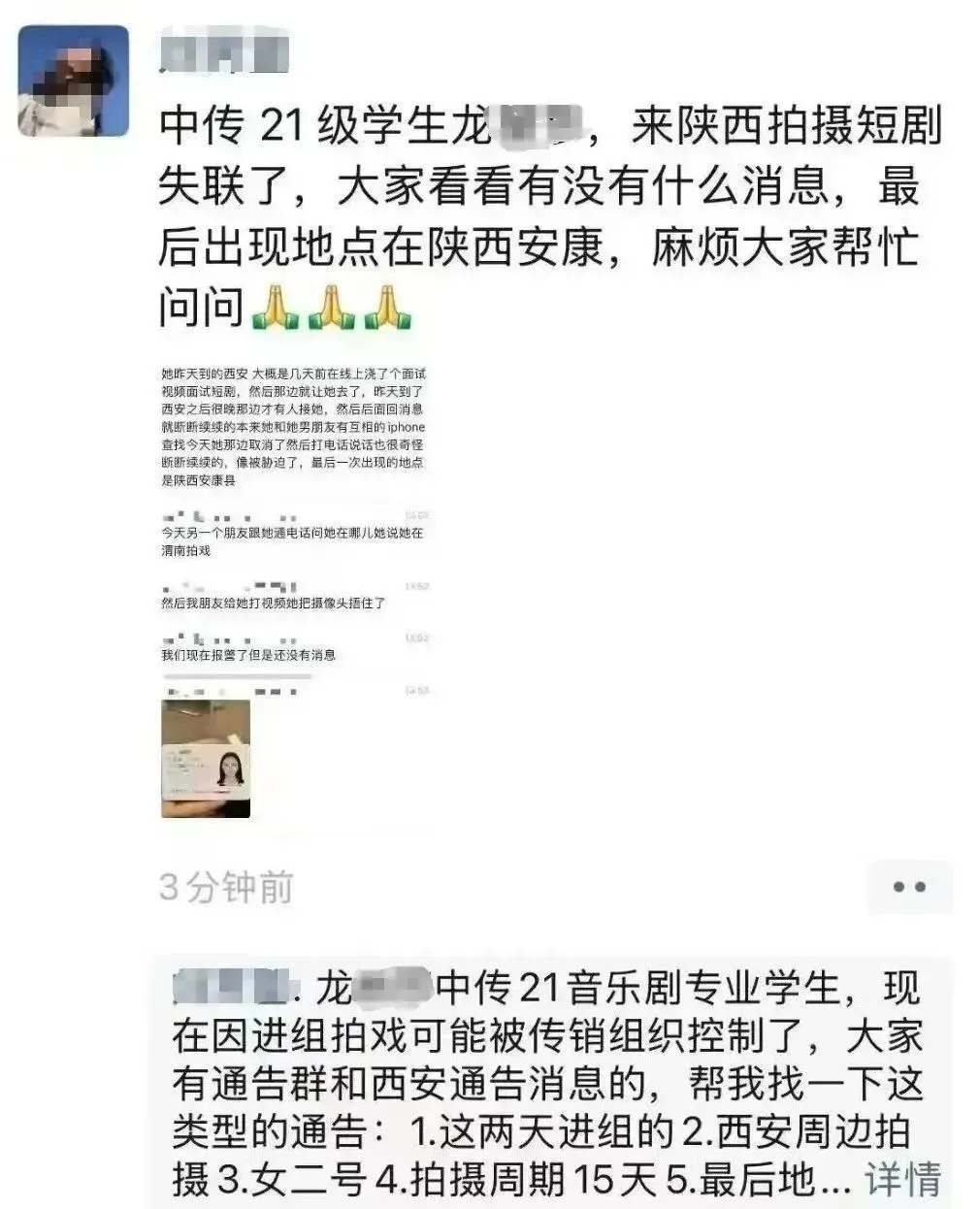 此前,多名网友发布消息,称中国传媒大学21级音乐剧专业同学龙丽莎进短剧组后失联,异常行为包括取消手机查找功能、打电话说话断断续续、打视频捂摄像头等。
