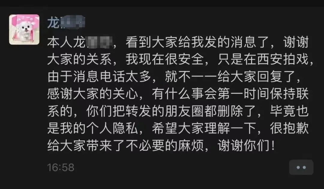 当日16时58分,龙某某的微信朋友圈发布消息:“看到大家给我发的消息了,谢谢大家的关系,我现在很安全,只是在西安拍戏,由于消息电话太多,就不一一给大家回复了,感谢大家的关心,有什么事会第一时间保持联系的,你们把转发的朋友圈都删除了,毕竟也是我的个人隐私,希望大家理解一下,很抱歉给大家带来了不必要的麻烦,谢谢你们!”