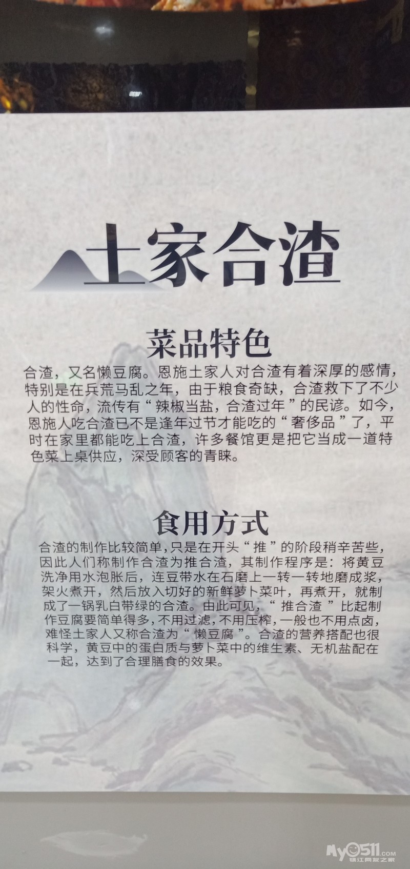 恩施的人很和气,他们知道自己要靠旅游发家,所以我们所接触到的司机导游饭店和宾馆老板还有服务员等人,都非常和善。恩施的美食也好吃。尤其是张关合渣,让我恋恋不忘。后来几天不止一次点合渣,都没有张关合渣好吃。那是用黄豆磨出来的连着豆渣豆腐和豆浆一体做出来的的一种食物,真是非常美味。