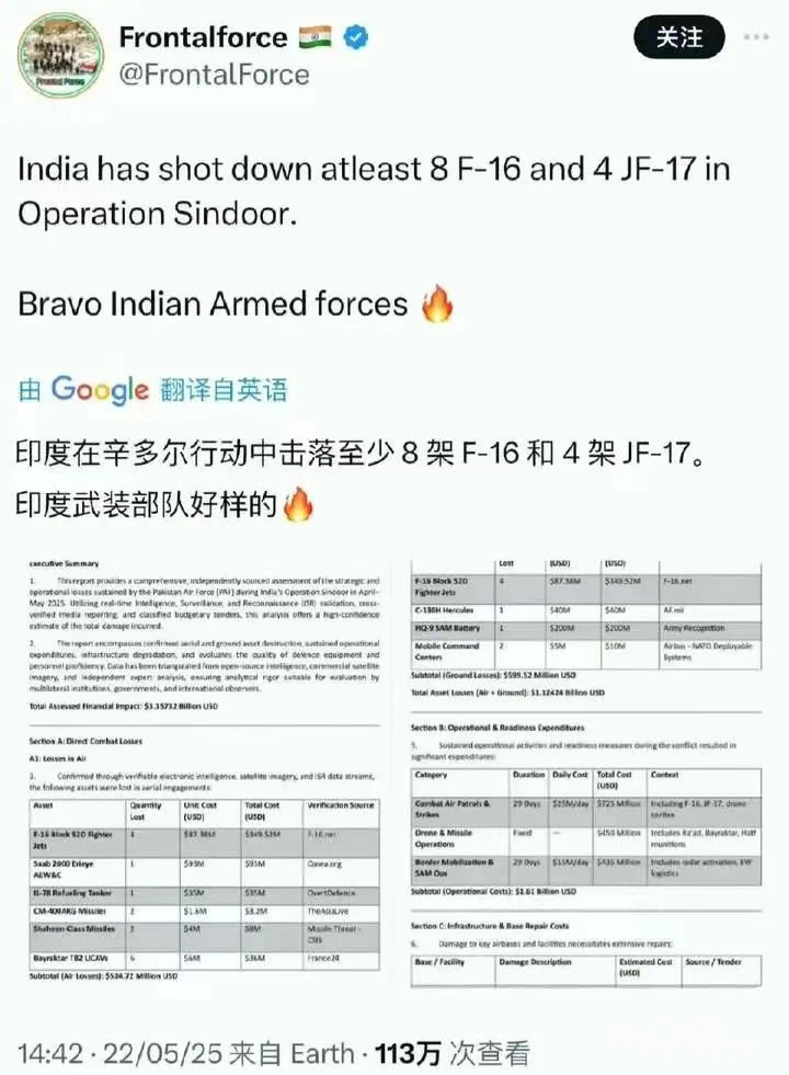 据此前报道,当地时间5月7日凌晨1时05分,印度军方发动代号“朱砂行动”的军事打击,向巴基斯坦及巴控克什米尔的9处目标发射导弹,巴基斯坦空军则在拦截反击中击落多架印度空军战机。巴基斯坦方面表示,巴基斯坦击落了5架印度空军战斗机,其中包括3架阵风战斗机。