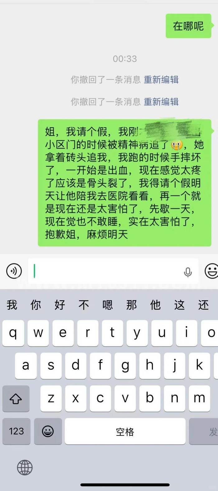 据该网友提供的聊天记录截图显示,红衣女子疑似患有精神疾病,她在小区内躲避红衣女子追逐时,不小心手部摔伤流血,准备去医院就诊,因此想请假一天。
