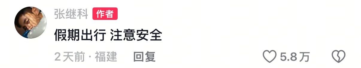 在视频评论区,张继科留言提醒大家:“假期出行注意安全。”