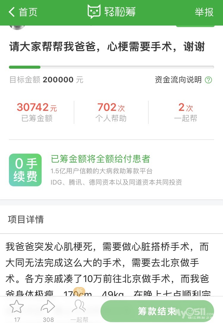 同学的朋友圈已经看不到了,只找到当时在网上发起的一个筹款。