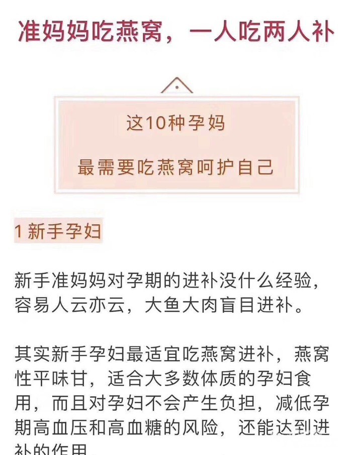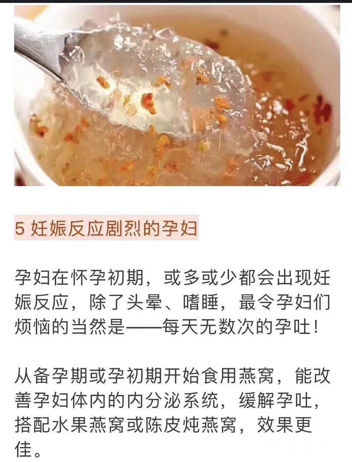 孕期前三个月和孕期后三个月,孕妇食用燕窝最好。