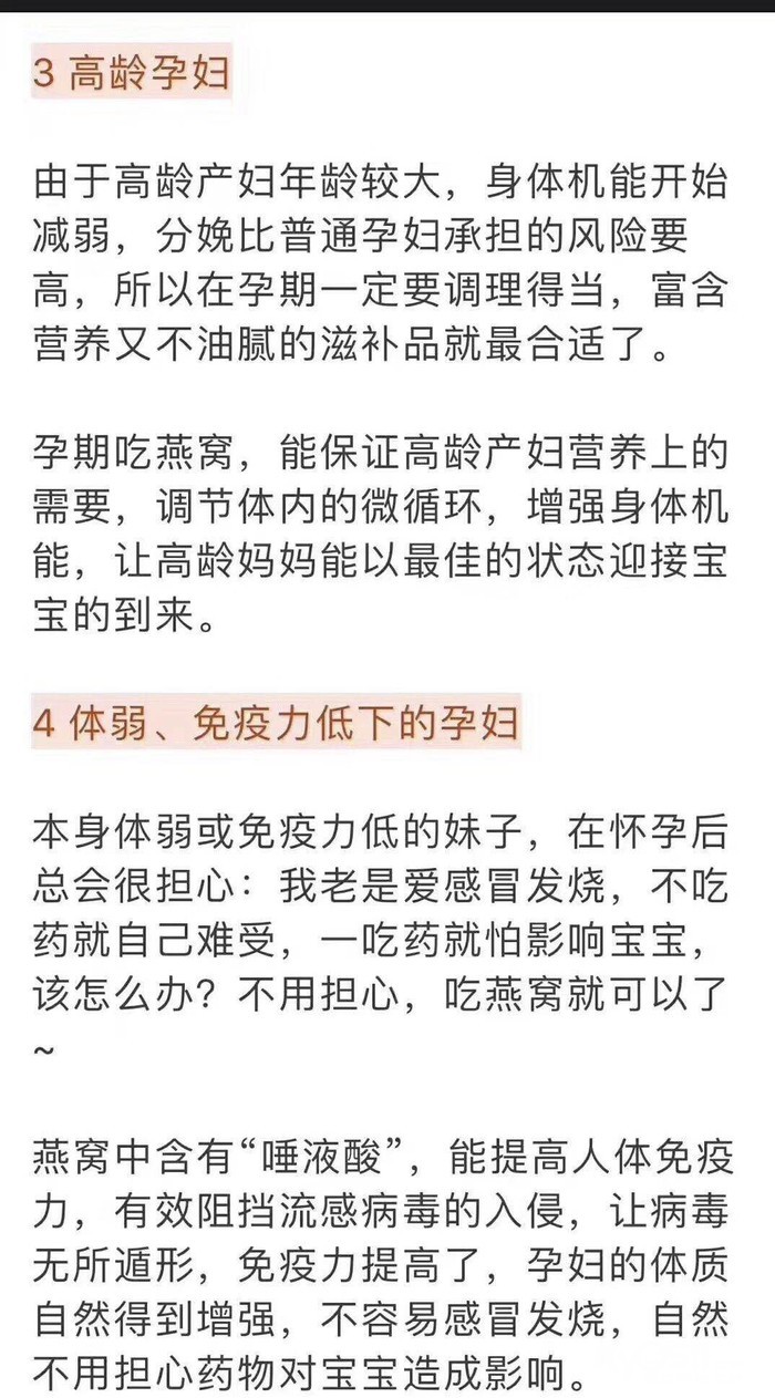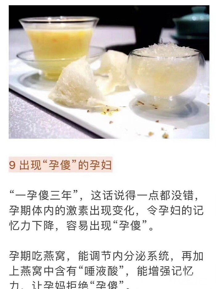 怀孕的头三个月时对胎儿神经系统和各种器官生长发育最关键的时期,燕窝中含有一种高达10%的生物活性成分、人体必需的重要成分“神经氨酸”——“燕窝酸”,“燕窝酸”这种珍贵成份仅仅存在于母乳中最好的初乳和燕窝中。