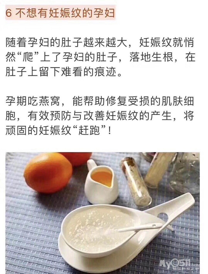 燕窝里含有一种多肽类物质——表皮生长因子(EGF),它能刺激多种细胞分裂增殖,促进细胞分化,补充胶原蛋白,对受损皮肤进行快速修复,特别对于妊娠纹的预防有非常明显的效果。