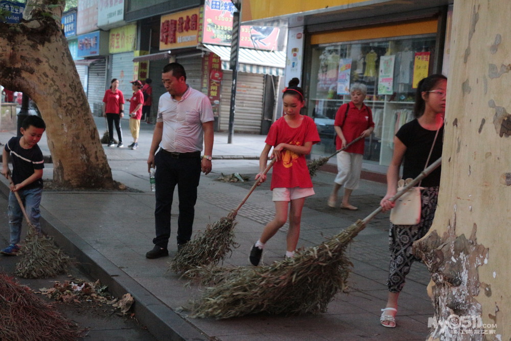 4:20从家出发,坐在电动车后面,清凉的晨风划过我的脸颊,是那么的柔软湿润,空气中没有汽车的尾气,使人神清气爽。4:50到达目的地和大部队汇合之后,我发现参加活动的人可真多啊,大部分都是家长带孩子来体验的。在组织方的安排下我们排成一列向保洁员们赠送了小礼品——每人一条毛巾。然后我们拍了大合影后,便领取扫马路的大扫帚,开始工作。