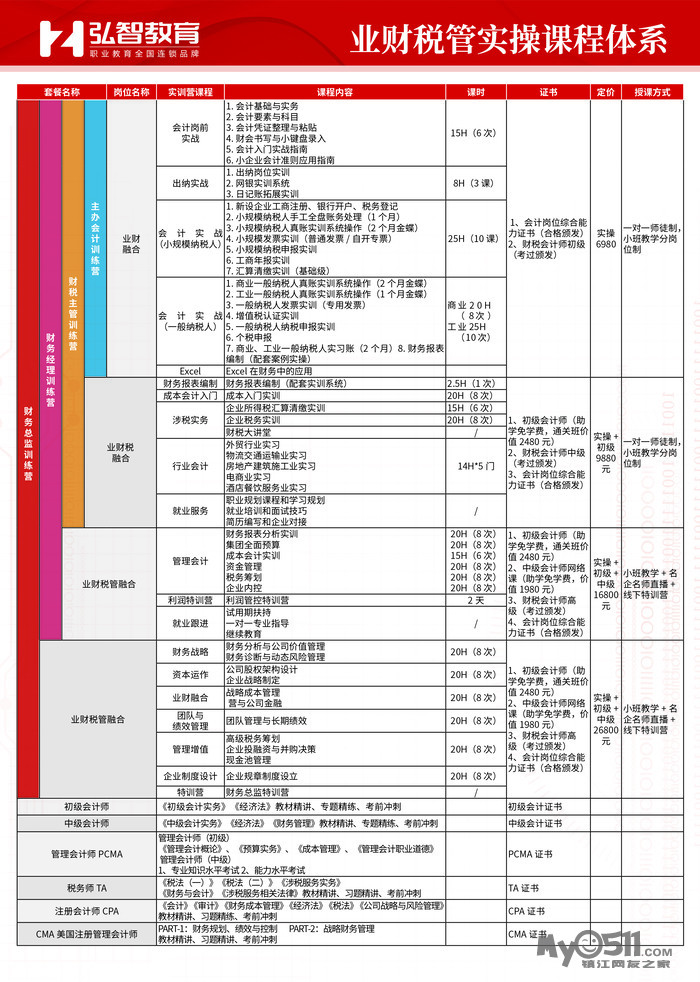 管理会计(MACC):1、规划与报告:财务报表编制;财务记账;战略性和战术性规划;预测;预算;绩效管理;成本会计和成本管理;内部控制;税务会计、税务管理与筹划 2、 决策:财务报表分析;公司金融;经营决策分析;企业风险管理;资本投资决策;职业道德3、科技:企业资源管理系统(ERP)和总账系统;信息系统和软件应用 4、运营:行业知识;运营知识;质量管理和持续改进;项目管理 5、领导力:激发与鼓励他人;沟通技能;变革管理;人才管理;协作和团队合作;谈判;冲突管理等。行业会计主管班:1、房地产企业会计账税一体化实训 2、物业企业会计账税一体化实训 3、物流企业会计账税一体化实训 4、酒店企业会计账税一体化实训 5、外贸企业会计账税一体化实训 6、旅游企业会计账税一体化实训 7、施工企业会计账税一体化实训 8、高新技术会计账税一体化实训 9、行政事业单位会计账税一体化实训 10、商场超市企业会计账税一体化实训