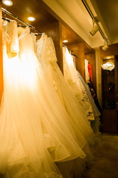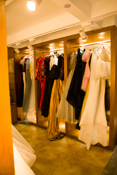 跟着小编从楼梯走上楼,首先映入眼帘的就是美美的婚纱礼服啦~款式都是美美哒!